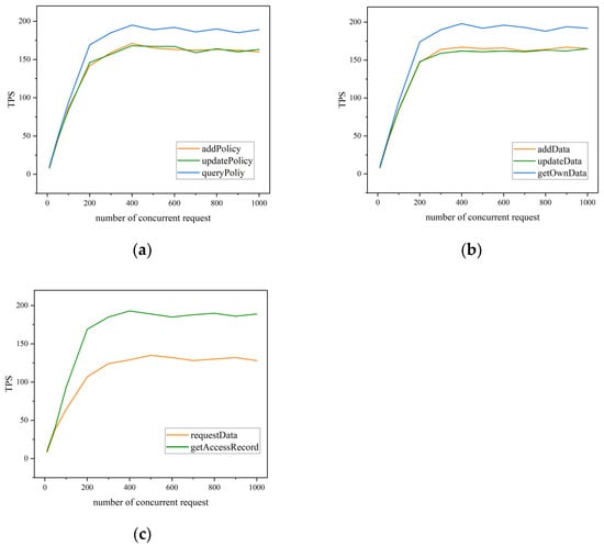 - The requestData() operation exhibits the lowest peak throughput among all operations depicted in Figure 9c. This is attributed to the fact that requesting data necessitates identity and permission verification, entailing greater computational overhead. In comparison to existing research schemes, the attribute information of data requesters is derived from digital certificates instead of being included in the data requests themselves. Although this approach increases the bandwidth requirements for network transmission, as each data request needs to transmit certificates, it may introduce a certain level of network load and transmission latency. However, embedding attribute information into digital certificates enables the separation of attribute details from data requests, thereby reducing the exposure risk of sensitive information during network transmission. Consequently, only authorized entities possess the capability to access shared data, while unauthorized third parties are unable to obtain sensitive information, mitigating the possibilities of attribute data forgery or tampering and providing enhanced security.