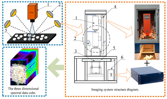 Hyperspectral imaging combines advanced knowledge from multiple disciplines to achieve a perfect fusion of traditional two-dimensional imaging techniques and spectroscopy. Guo and Ma described the linear relationship between spectra and data by the partial least squares (PLS) method, which could realize the analysis of adulterated rice and the prediction of pork meat fatty acids [5,6]. Zhang, Jiang, et al. employed the support vector machine (SVM) in combination with shortwave infrared hyperspectral techniques for cotton foreign matter classification, which significantly improved the detection rate of plastic films in cotton compared to conventional methods [7,8,9].