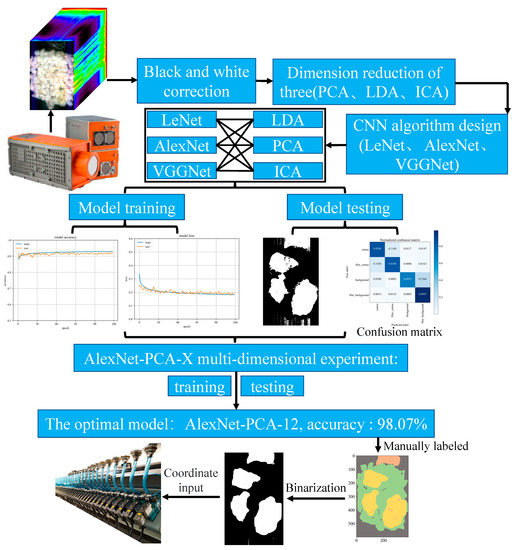The technical route of the film sorting system is illustrated in Figure 2, where seed cotton mixed with the film is given to the study subject. Firstly, a hyperspectral camera is used to collect 1000–2500 nm hyperspectral images. Secondly, the experimental validation involves nine models, including black and white correction, dimension reduction, and CNN training and testing. The purpose is to determine the best models for hyperspectral data dimension reduction and CNN. The binarization is established to display the recognition outcome of the optimal AlexNet-PCA-12 model, which has an eminent recognition accuracy of 98.07%. Finally, the coordinates of the film are fed into a high-speed spray valve to complete the film removal in the practical application sorting tests.