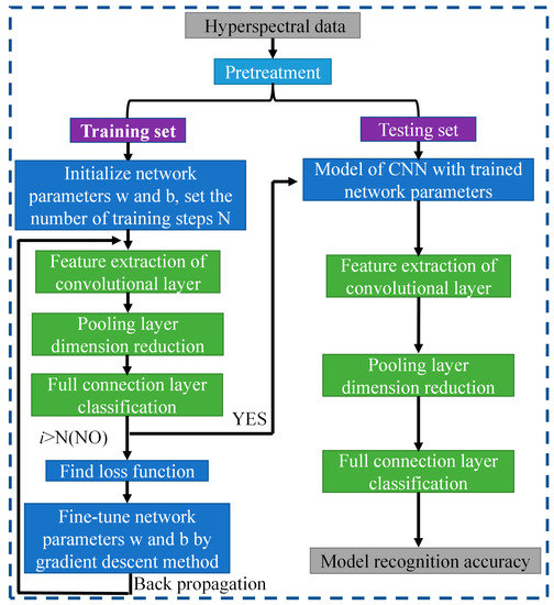 In this section, three CNN models based on LeNet, AlexNet, and VGGNet are constructed for hyperspectral image recognition. The CNN schematic is shown in Figure 3. The schematic involves two steps. Firstly, the hyperspectral data are used to train the model and extract useful image features. Secondly, the trained features are applied to the testing set for verification, and the resulting recognition accuracy is outputted. Additionally, the network parameters are regulated through gradient descent and back propagation algorithms, which ascertain network parameters in time.