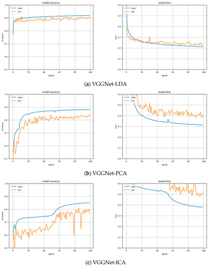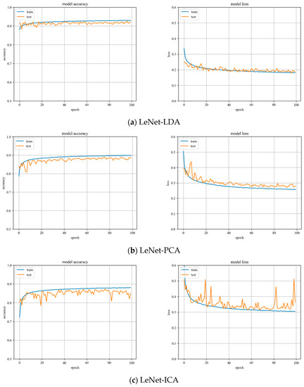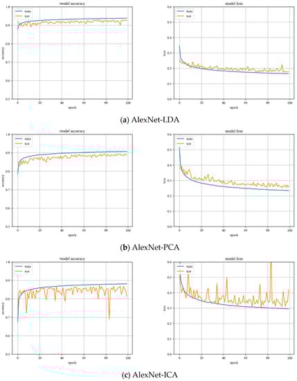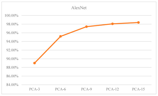 In Figure 12, the accuracy and loss value curves of the AlexNet model are shown when PCA is used to reduce the dimensionality by 6, 9, 12, and 15. The accuracy curve of the test set starts to converge at the training process of up to 40 iterations and mostly peaks at the training process of up to 60 iterations. The variation is stable throughout the training process and the model has great stability.