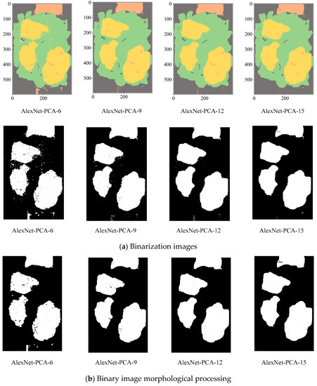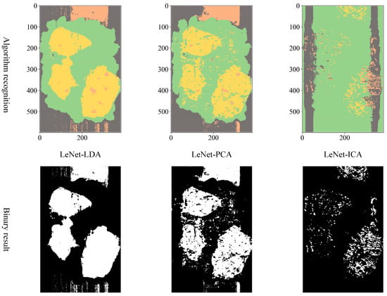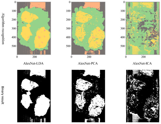 Considering the actual sorting system only needed to locate the spatial coordinate position of the film, the classification results are combined from four categories into two categories: “film on cotton” and “film on background” are classified as film, and “cotton” and “background” are classified as non-film. The binarized images are shown in Figure 9, Figure 10 and Figure 11. It can be seen that the combination of the AlexNet neural network structure and the LDA algorithm indicate the best recognition results, while the VGGNet neural network structure and the ICA algorithm denote the worst recognition results.