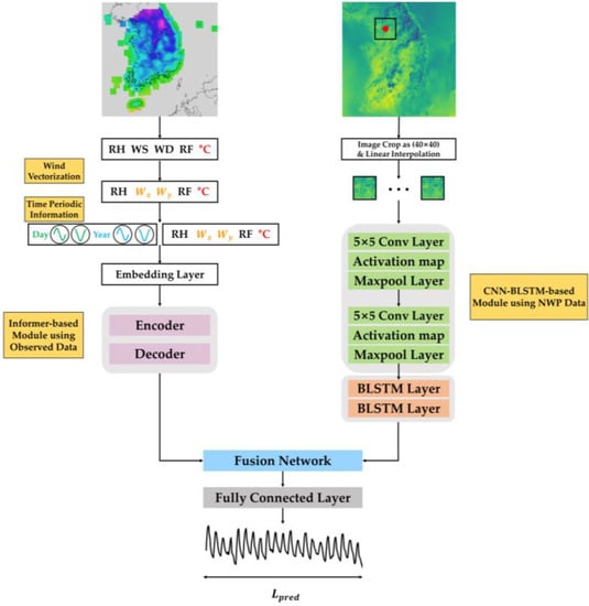 Hence, to address these issues, we substituted LSTM with the Informer model, which demonstrated robustness against long-term dependency problems. Furthermore, we introduce a method for combining diverse representations of observational data and numerical weather prediction image data. During the learning process of deep neural networks, the vanishing gradient problem is encountered, which signifies the loss of the gradient. If the interval between time points is expanded, a long-term dependency issue arises, where the influence of information from a distant past point is attenuated in relation to the current time point. Thus, as a solution to these problems, we propose replacing LSTM with the Informer model, which is resilient to long-term dependency issues. Additionally, we propose a strategy for integrating various forms of observational data and numerical weather prediction image data in a comprehensive manner.