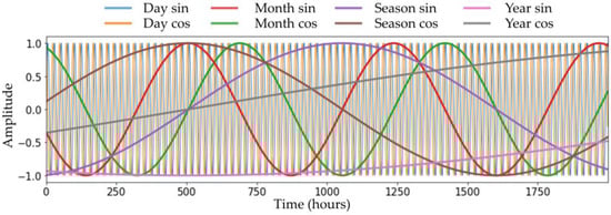 Plot of different time-periodic information. This was plotted by generating time-periodic information with different periods. There was a total of four periods applied: day, month (30 days), season (90 days), and year (365 days). Eight types of time-periodic information were created by generating sin and cos signals for each period. For example, Day sin is a sin signal, with 24 h as a single cycle period.