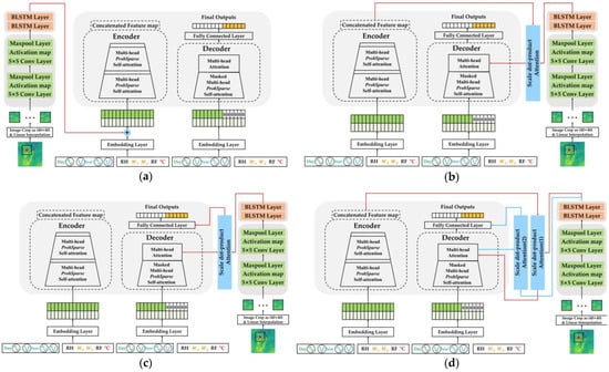 Architectures of various ways of fusioning the Informer-based model using observed data and CNN–BLSTM-based model using NWP data: (a) Informer addition model; (b) Informer encoder fusion model; (c) Informer decoder fusion model; and (d) Informer encoder–decoder fusion model.