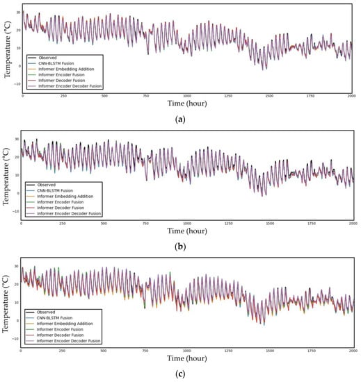 As shown in the table, the different fusioning of the Informer-based model provided different performance results. In fact, the performance of the Informer encoder fusion model showed the lowest RMSE and MAE values when the prediction times were greater than or equal to 24 h, while that of the Informer encoder–decoder fusion model was the best when the prediction times were smaller than 24 h. However, the performance results of the Informer embedding addition model and Informer decoder fusion model were worse than those of the Informer encoder fusion model and Informer encoder–decoder fusion model. The reason why this result was obtained is due to the fusioning method used on the LDAPS data and AWS data. In other words, as shown in Figure 5a, LDAPS image data were directly fused into the embeddings of AWS data. Thus, the feature representation of LDAPS image data was different from that of AWS data regarding vector embedding. Similarly, the Informer decoder fusion model combined the decoded AWS data and LADPS embedding vector, as shown in Figure 5b. Consequently, fusioning methods should combine AWS and LDAPS data in a level of embedding vectors, as shown in Figure 5c,d.