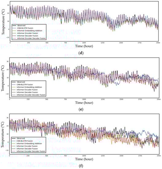 Finally, Figure 6 illustrates a time series plot of the observed data and predicted temperature data from 09:00 on 4 May 2015 to 23:00 on 23 December 2015 for the 6, 12, 24, 72, 168, and 336 h future predictions. As shown in the figure, the shorter the forecast period is, the better the prediction graphs reflect the trend in the observed data graph. There are more portions where the graph does not match as the prediction time grows, and in the case of the 336 h prediction, it is evident that the predicted graph is drawn somewhat differently from the graph of the observed data in a significant number of sections. For the 6 to 24 h predictions, which are relatively short-term graphs in the figure, all the models appear to closely resemble the observed data graph, making it challenging to determine which model is the best with a human eye. This contrasts with the prior model, the CNN–BLSTM fusion model.