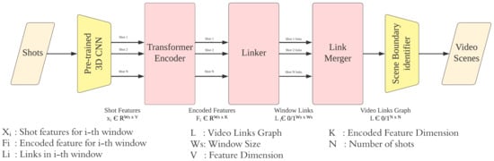 TELNet relies on a pre-trained and fine-tuned 3D CNN model for extracting video shot features and a stack of multi-head self-attention networks for learning associations among the extracted shot features—transformer encoder. The linker network establishes links among shots based on the encoded shot features and creates a graph of shots (nodes) and their edges (links). Scene boundaries are declared where no overhead links exist between consecutive shots. Assuming that each scene can be represented by a key-shot which is the shot closest to the mean of shot features within each scene, video graphs are created and used as a label for the linker network. TELNet scans the video shots in batches (within a rolling window) and aggregates results when reaching the end of the video.