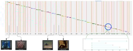 A video shot is the basic video unit comprising a sequence of visually similar frames taken from a single camera, usually at a fixed angle. Given the similarity of frames within a shot, multiple established shot detection algorithms have been proposed for video processing tasks []. Chu et al. calculated the pixel-wise RGB difference between consecutive frames []. Zawbaa et al. studied the percentage difference of 32 × 32 blocks in HSI space []. Potapov et al. proposed a kernel temporal segmentation (KTS) algorithm, which detects shot boundaries distinguishing between step changes due to noise and step changes due to the variation in the underlying multidimensional features []. Sokeh et al. determined shot boundaries by applying k-means clustering on frame flow histograms []. Even though there are subtle differences among shot detection algorithms, shot boundaries that are identified based on shallow visual features such as color histograms are comparable with shot boundaries identified based on deep visual features [].