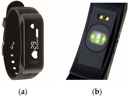 Wearable device for HRV measurement: (a) appearance on the front side; (b) three LEDs on the reverse side.
