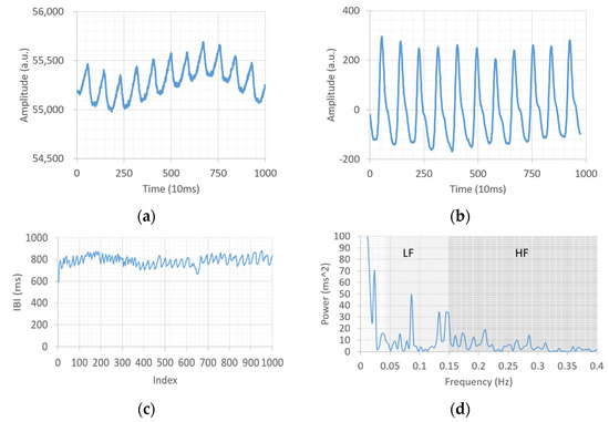 HRV processing stages from PPG signal: (a) raw PPG data; (b) processed PPG data; (c) IBI curve; (d) HRV spectrum. a.u. stands for the arbitrary unit.