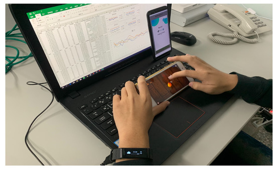 All participants conducted the experiment in a noise-free room with a temperature of 26 degrees Celsius (i.e., 78.8 degrees Fahrenheit) and an appropriate light. Because HRV is known to correlate with chronic disease and cancer, age and health status are two main characteristics in selecting participants. Eight male and two female healthy participants, aged between 20 and 25 years, were involved in the experiments. The consent of all the participants was obtained after providing them with an explanation of the experiment in terms of purpose and data collection protocol. The mobile games under consideration were Subway Surfers, Fruit Ninja, Tap Tap Music, Tennis Clash, and Push Battle. For each participant, only games that he or she never played before were included in the dataset. One sample was recorded when a participant played a mobile game following the abovementioned four-stage process. The total amount of data collected in the experiments was 36. Figure 4 shows a snapshot captured during the experiment stage (2). From Figure 4, the participant wore a smart band on the left hand to measure heartbeat signals. Meanwhile, an upright smartphone performed an APP to collect heartbeat signals from the smart band continuously. The laptop screen presented the collected APP data for further analysis.