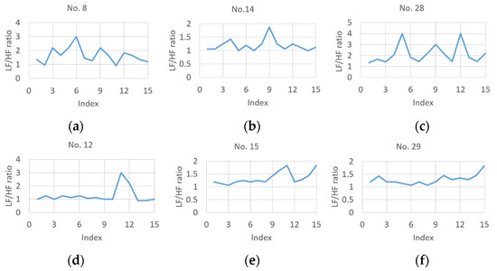 Selected LF/HF ratio curves from dataset: (a–c) high-score group; (d–f) low-score group. Each Figure is labeled with its serial number in the experiment.