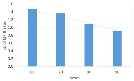 Table 2 lists the definition of all notations in (9). Estimating parameters of (9) is known as a regression problem. In order to observe the performance effect on correlation discontinuity, two prediction models were developed: Model 1 selects the dataset of the high-score group as the training data for (9), and its optimal parameter vector {α, β, γ, ε} is {0.21, 1.76, −0.46, 72.59} with R2 = 0.20. In addition, Model 2 uses the whole dataset to build a prediction model based on (9) for the low-score and high-score groups. The parameter vector {α, β, γ, ε} of Model 2 is {3.10, 2.03, 2.29, 54.27} with R2 = 0.21. Although building the respective training data for Model 1 and Model 2 is intuitive, the relation discontinuity can impede group differentiation. As a result, it can be difficult to apply the proper prediction model for a sample without a group label. As shown in Figure 6, the SD of LF/HF ratios has a linear continuity across two groups and can be adopted to realize the group differentiation in this study. By inspecting data in Figure 6, a sample is regarded as a low-score group as the SD value is smaller than 1.47. Otherwise, the sample belongs to the high-score group.