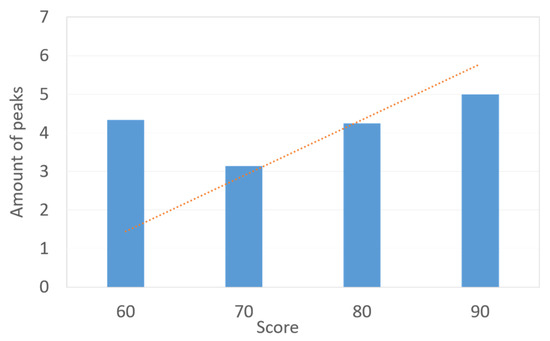 Bar chart and relation (dotted line) between subjective parameter (game fun score) and objective parameter (amount of peaks).