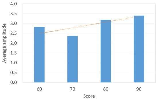 Bar chart and relation (dotted line) between subjective parameter (game fun score) and objective parameter (average amplitude of the peak).