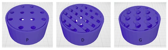 TPMSS are a type of implicit surface that exhibits periodicity in three independent Cartesian directions and has a mean curvature of zero [21]. Recently, these structures have gained attention for their applications in piezoresistive sensors [19]. In our study, we explored three distinct TPMS types: P, D, and G [17] (refer to Figure 3). In particular, based on their unit cells, we designed cylindrical sacrificial templates with the same total volume as the GS.
