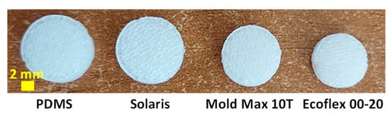 The production of the open-cell foams involves modeling sacrificial templates made of ABS, followed by infiltration with a polymer. Before proceeding with the foaming process, we needed to investigate the effect of acetone on various non-porous cylindrical polymer samples (bulk structures). These bulk samples, with a thickness of 6 mm and a diameter of 12 mm, were produced using a brass mold and comprised seven different materials, including silicone rubbers and polyurethanes: PDMS (Dow, Midland, TX, USA), Ecoflex® 00-20, Solaris, Mold Max 10T, Reoflex 20 Vytaflex 10, Dragon Skin 10 and Vytaflex 20 (Smooth-on, Macungie, PA, USA).