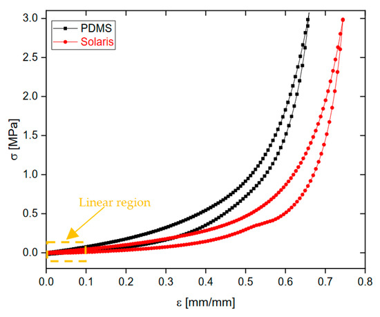 Comparison between the stress–strain curves of the bulk samples of PDMS and Solaris.