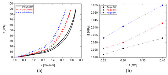 Stress–strain curves of PDMS foams for θ = 60° and different values of s (a); Young’s modulus as function of s and θ (b).