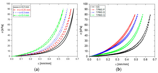 The three types of TPMS (P, D, and G) were designed to maintain the same total volume as the GS. As can be observed from Figure 9b and the comparison of the Young’s modulus reported in Table 3, the optimized GS resulted significantly more flexible than the cellular structures obtained with TPMS-based geometry in all the investigated pressure ranges (0–80) kPa. This time, to ensure that the mechanical test configuration limits (10 N load cell) were not exceeded, the analysis was conducted within the range of 0 to 80 kPa. This range was chosen specifically considering the higher stiffness of the TPMSS.