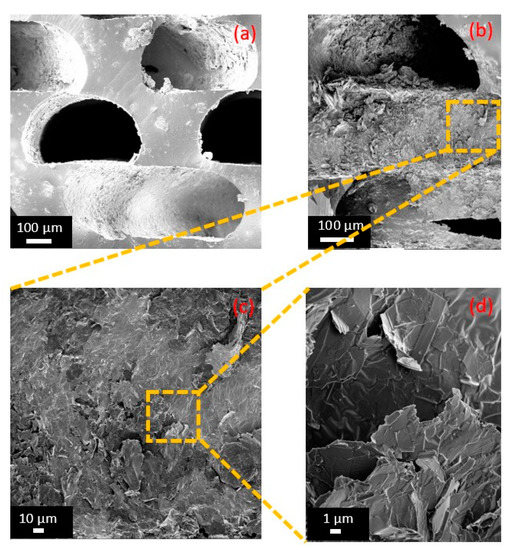 Cross-sections of porous GS with and without GNPs (b,a). Different magnifications of a cross-section of the polymer structure infiltrated with GNPs: (c) 1 kX and (d) 10 kX.