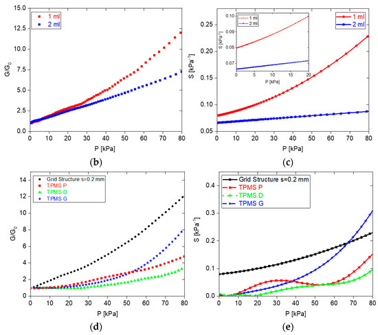 This characteristic is particularly pronounced in the D structure, which exhibits insensitivity until a pressure of 20 kPa is reached (Figure 11e). From our observations, we can conclude that up to P ≈ 67 kPa, the GS displays higher sensitivity compared to the TPMSS. This can be attributed to the smaller pore size and increased mechanical flexibility of the GS.