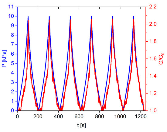 Conductance variation of GS (red) during six consecutive cyclic compression tests in the pressure range 0–10 kPa (blue).