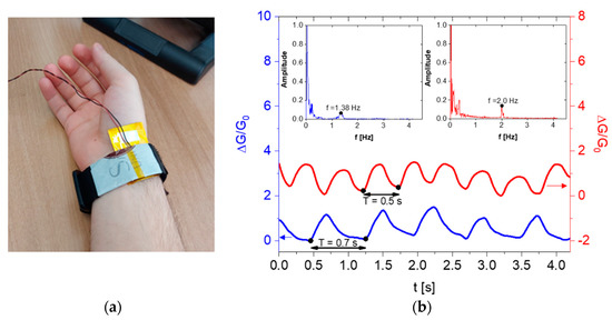 The electrical measurements were conducted using the same instrumentation employed for the electromechanical characterizations described in the previous paragraph. The bracelet was worn on the user’s wrist to measure the corresponding conductance at rest and after 5 min of aerobic activity. Figure 13b displays the normalized conductance variation as a function of time before and after the activity. At rest, the signal’s local maxima are approximately 0.7 s apart, indicating a heart rate of approximately 80 beats per minute (bpm). However, after 5 min of aerobic activity, the interval between the peaks decreases to around 0.5 s, corresponding to a heart rate of approximately 120 bpm. These findings are further supported by the fast Fourier transform (FFT) analysis of the signals, as shown in the insets of Figure 13b.