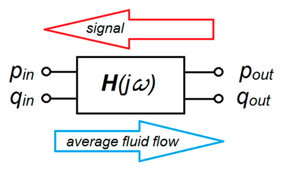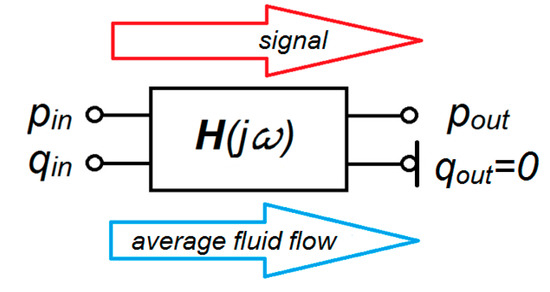 In the measuring hose, the model of an adequate two-port network can be assumed as the object presented in Figure 2. The pressure transducer is mounted on the output port, so the output volumetric flow rate, qout, is neglected.