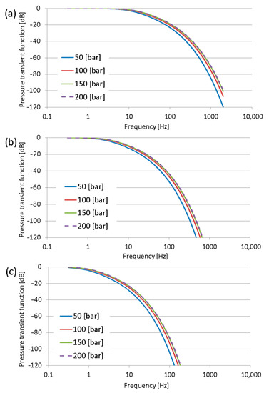 From the obtained results, it can be assumed that the measuring hoses can be used as the hardware low-pass filters during the digital acquisition of the pressure waveforms. The slopes of the frequency performance curves of the measuring hoses are not constant, as in typical low-pass filters. The slope for the first range of each curve of the pressure transfer function equals −20 dB/decade, so these values are nearly first-order low-pass filters.