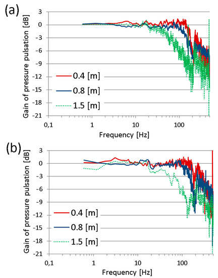 The results of the tests considering the cut-off frequency of the measuring hoses using both methods are similar. The essential difference is that during the tests using the impact impulses as excitation signals, the amplification of the pressure pulsation was not observed. Each measuring hose acted like a low-pass filter with a similar slope, approx. −12 dB/decade. Therefore, the assumption that the pressure pulsations were strongly damped by measuring hoses is not completely true. The authors hoped that the dumping of the measuring hoses would be at least −20 dB per decade, according to Figure 3a.