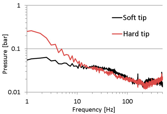 The hardness of the impact hammer tip determines the impulse shape (amplitude and duration) and the excitation bandwidth. The research was carried out for two rubber tips with different hardness. The tip type of the impulse hammer influences the form of the excitation signal; as shown in Figure 5. The sampling frequency of the pressure signal in the measuring point was 10 kHz and 100,000 samples were saved. The excitation signal was analysed using the FFT method with a flat-top window width of 16,384 samples. The results were averaged from three FFT windows. When a soft hammer tip was used, an almost uniform spectral distribution of the excitation signal was obtained in the frequency range from 1 to 100 Hz. This is very convenient for modal tests and the derivatives thereof. The only drawback of the excitation signals generated by the soft hammer tip is the low value of the excitation signal. For this reason, the research results for both hammer tips will be presented further in the article; Figure 9.