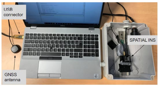 SPATIAL inertial navigation system connected to a computer through USB and a GNSS antenna.