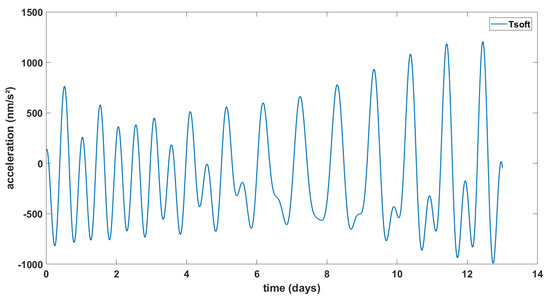 Land tides or solid tides are also defined as body tides in solid Earth geosciences [22]. As with ocean tides, the Moon has the greatest effect on body tides because it is closer to the Earth. The Sun does have an effect on body tides as well because of its very large mass and its strong gravitational field. As the Earth rotates around the Sun and the Moon, each of their gravitational fields pull on the Earth. Because of this pull, there are small deformations (or bulges) on the Earth’s surface known as body tides. These bulges face the Moon and the Sun as the Earth rotates. The Tsoft model predicts the Earth’s displacement and gravity change due to Earth tides in time but also in space. Body tides are lower than ocean tides, and the displacement of the Earth’s surface is usually no greater than ±30 cm. A simplified model is given to express the gravity solid tides, , [22]: