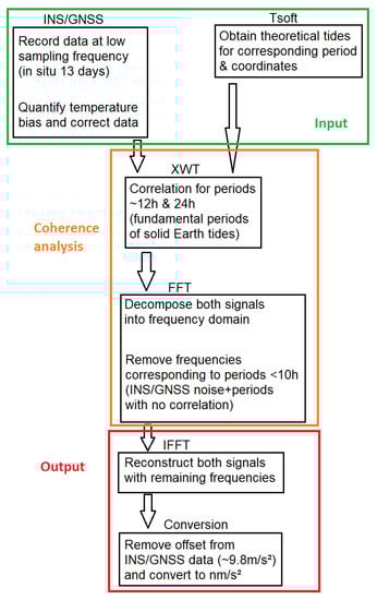 Using the data recorded by the MEMS INS/GNSS and the theoretical data from Tsoft, we proceeded by applying the temperature correction to the raw data before computing the continuous wavelet transform (CWT) of both signals. With the CWT of each signal, the cross wavelet transform (XWT) was computed, which highlights the correlation in time for different periods between two signals, even when they are not in phase. By decomposing the signals into their frequency domains and applying a low-pass filter (sub 10 h), we were able to get rid of the noise of the INS/GNSS, and then we reconstructed the signal with the remaining frequencies.
