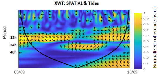 Wavelet coherence between theoretical solid Earth tides (Tsoft) and accelerometric INS data.