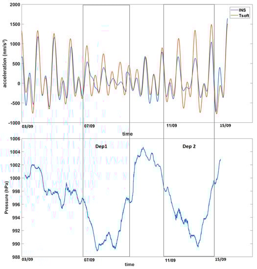 Reconstructed signals (theoretical and INS/GNSS data) after removing the frequencies corresponding to the periods < 10 h; below shows the atmospheric pressure recorded by the INS/GNSS for the same period (Dep1 and Dep2: lower atmospheric pressure).