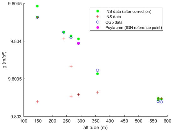 At each stop location, we recorded using the CG-5 gravimeter and INS/GNSS, and the data were compared to validate our gravity measurements. In Figure 10, the red crosses represent the MEMS INS/GNSS data at each stop location before temperature correction and the green dots represent the gravity data after temperature correction. The blue circles show the data recorded by the CG5 gravimeter (after correcting the drift), which are used as the reference gravity values. Because this mission was a round trip, there are three altitudes that have two measurements (Laboratory at 150 m, Prunet at 250 m and Cammazes dam at 570 m). The purple dot is the value recorded by the CG-5 gravimeter at Puylaurens.