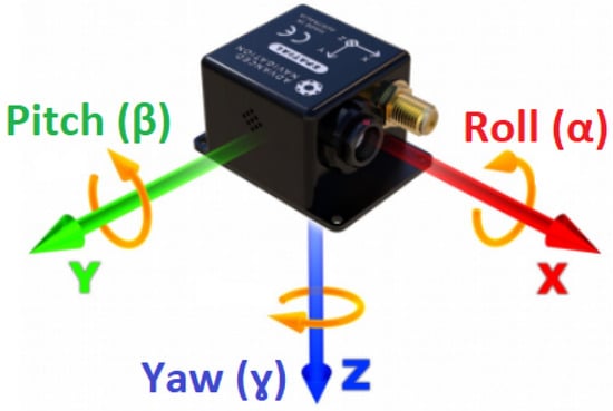 Schematic view of the SPATIAL model and the rotations; yaw or heading (), pitch () and roll () around the z-, y- and x-axes, respectively (from Advanced Navigation datasheet).