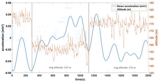 The data recorded when the MEMS INS/GNSS is embedded in a drone, installed close to the drone’s center of mass, showed promising results. The velocity and GNSS data, which are calculated using an algorithm developed by Advanced Navigation that is up to 10 times more accurate than a traditional Kalman filter, are precise enough to derive the acceleration components. Through high-frequency sampling of accelerations, velocity, GNSS information, pitch, roll, yaw, angular velocity, etc., at high frequencies, we can effectively use this dataset to reduce the accelerometric signal recorded during the flight. We filtered this reduced signal at 0.0083 Hz (or 120 s) because with an average velocity of 30 m/s, this gives us a spatial resolution of 1.8 km, the approximate length and width of our flight area, which has both a homogeneous soil density and no significant topography variations. The remaining signal after all corrections should be equal to that of the drone at rest with the motor turned off and only presenting the altitude’s influence. By changing its altitude, the drone sensed the change in gravity, conformal to the upward (or downward) continuation of 0.3085 mGal/m, but hardly detectable because of the presence of noise of a higher order of magnitude.