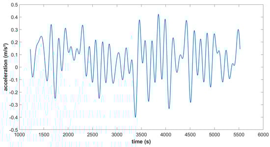 In a second step, we take the recorded value during the drone flight, after the drone has reached a stable altitude and before the landing procedure has started. As mentioned before, these accelerometric data are multiplied with the rotation matrix for each point so we are working in the NED (North, East, Down) frame, and we only consider the DOWN component of the acceleration, which corresponds to the vertical acceleration towards the mass center of the Earth. From this dataset, we remove the acceleration calculated by deriving the velocity given by the MEMS INS/GNSS (calculated from its GNSS coordinates) similarly to the process performed when analyzing the straight lines.