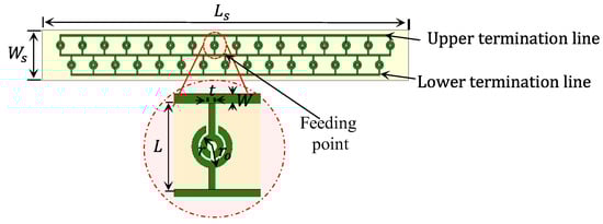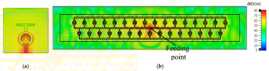 The value of is supposed to be 0.875 nH, so the value of is calculated as 0.05 PF. To obtain a low-quality factor, the value of is 10 ohms. Accordingly, a single element of a planner SRR antenna was simulated using ADS software, as shown in Figure 4. Figure 5 compares the reflection coefficients of the CST design and the RLC circuit model, which were extracted using ADS software, and the results show good agreement. The reason for neglecting the effect of the upper termination line shown in Figure 2 in the single-element equivalent circuit is due to the presence of an opposing current in the corresponding lower section. This opposing current leads to a cancellation effect, as shown in the electric field distribution in Figure 3, resulting in the negligible contribution of the upper termination section to the overall circuit behaviour. Figure 3a presents the electric field distribution of a single element, emphasising that even when simulating a single element, the influence of the horizontal termination section is minimal and can be ignored.