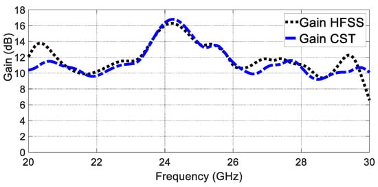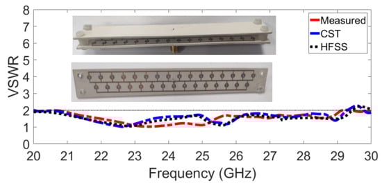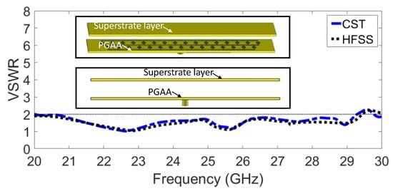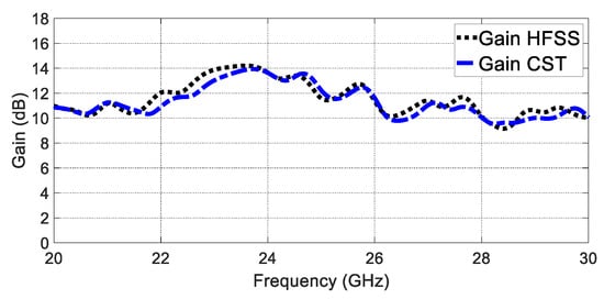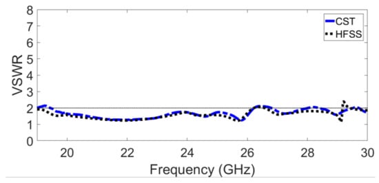 Two simulators were used to verify the simulated prototype results: CST Microwave Studio Version 2021 and HFSS Version 2021. The voltage standing wave ratio (VSWR) of the proposed GAA is demonstrated in Figure 6, which shows a wide bandwidth ranging from 20 GHz to 26 GHz with a magnitude of <2 dB. A very good agreement between CST and HFSS results is observed.