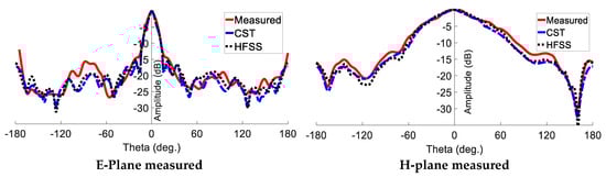 For radiation pattern evaluation, the proposed antenna was used as the receiver, and a conventional millimetre-wave horn antenna served as the transmitter. The transmitter and receiver antennas were kept a wavelength or more apart. To obtain accurate gain estimates, both antennas must be driven by a uniform plane wave. This means that a region free of unwanted reflections and transmissions should be considered. To eliminate any unwanted interference, millimetre-wave absorbers were installed all around the measurement equipment. The gain transfer technique was used to assess the antenna radiation characteristics of the antenna, and the results are presented in Figure 12 [32]. There is a clear correlation between the simulated and measured trends. Due to manufacturing tolerance, the presence of the VNA, and the metal antenna mounts inside the chamber, the measured results show minor variations. The radiation pattern of the proposed PGAA with an added superstrate is shown in Figure 13, both in measured and simulated form. The comparison shows strong agreement and highlights an impressive reduction in SLL, which is less than −15.