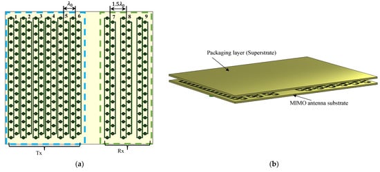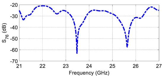 According to Equation (2), the array factor is advised to be null at every grating lobe of , and vice versa, to achieve a low SLL for a specific MIMO arrangement. Therefore, the spacing between the elements is chosen to be for and 1.5 for , as shown in Figure 14a. Figure 14b illustrates the MIMO configuration, including the packaging (superstrate). The array factor and 3D radiation pattern of the proposed configuration are depicted in Figure 14c,d. According to the proposed MIMO configuration, the SLL of the virtual array is less than −20 dB along the effective monitoring angle from 60° to 120°, where the AFTX nulls cancel the AFRX grating lobe. The coupling between the closest Tx–Rx antennas is examined and shown in Figure 15, illustrating excellent isolation of more than 20 dB.