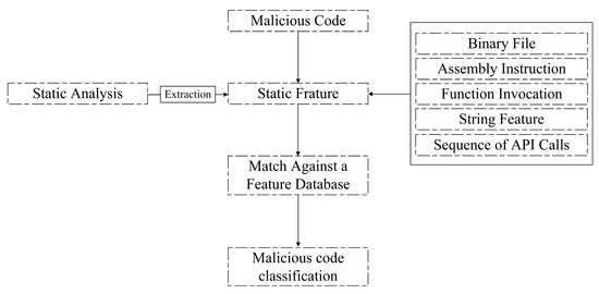 Static detection technology involves analyzing disassembled or decompiled programs to extract data features without the need to execute the code or program being examined. It is a popular approach among researchers for analyzing malicious code. Static features, such as binary files, assembly instructions, and function calls, are commonly utilized in this process [17,18]. The detection process based on static analysis is depicted in Figure 1. Figure 1 showcases the sequential steps involved in the detection of malicious code through static analysis. The disassembled or decompiled program is thoroughly examined to extract essential data features. These features provide valuable insights into the behavior and characteristics of the code, enabling the identification of potential threats. Static analysis plays a vital role in strengthening the security measures against malicious code by detecting patterns and anomalies without the need for code execution. By leveraging static features, researchers gain valuable knowledge about the code’s structure, functionality, and potential risks. This aids in the development of robust detection mechanisms and contributes to the ongoing efforts in combating malware and enhancing cybersecurity.
