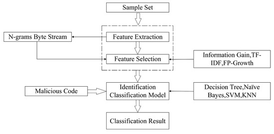 Machine learning is a powerful approach that leverages extensive data to identify meaningful patterns and extract relevant features, allowing for accurate predictions on unknown data. In the realm of malware detection, where the repository of malicious code continuously expands, traditional methods face challenges in maintaining extensive feature databases and effectively distinguishing new variants of malicious code. Machine learning, with its learning and predictive capabilities, offers a promising solution to these issues. In machine learning-based detection methods for malicious code, the initial step involves extracting features from the code samples. These features serve as the foundation for subsequent processing and analysis. Feature processing techniques are then applied to select the most informative and discriminative features, which are crucial for training a robust classification model. This trained model can subsequently be utilized to accurately detect and classify malicious code instances. To illustrate the workflow of machine learning-based malicious code detection, Figure 4 presents a comprehensive flowchart. This visual representation outlines the sequential steps involved, including feature extraction, feature processing, model training, and the final detection process. By following this structured approach, machine learning algorithms can effectively contribute to the detection and mitigation of malicious code threats. Incorporating machine learning into the field of malware detection holds immense potential for improving accuracy and efficiency. By enabling automated learning from data, machine learning empowers security systems to adapt and respond to the evolving landscape of malicious code, ultimately bolstering the overall defense against cybersecurity threats [23,24].