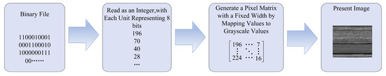 Drawing inspiration from Nataraj et al. [26], a similar approach is adopted by converting the collected raw malicious binary files into grayscale images. The image conversion process is illustrated in Figure 6. Initially, the binary file is treated as a sequence of 0 s and 1 s. Each 8-bit binary segment is interpreted as an unsigned integer, accurately representing a grayscale value between 0 and 255. A value of 0x00000000 (0) corresponds to a black pixel, while a value of 0x11111111 (255) results in a white pixel. For values ranging from 0 to 255, the pixel falls within a spectrum of gray shades.