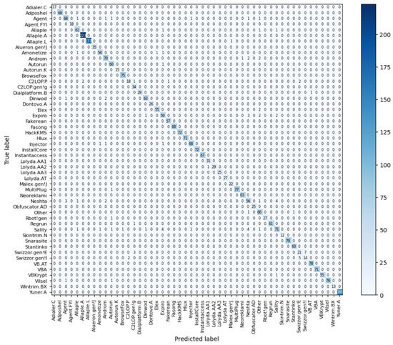 Regarding Error Analysis, the causes of classification errors in the confusion matrix presented in Figure 12 and Figure 13 can be primarily analyzed based on two key factors. Firstly, within malicious code families, such as Lolyda. AA1, Lolyda. AA2, Lolyda. AA3, C2LOP. gen!g, and C2LOP. P families, variants often exhibit extensive code reuse, resulting in minimal differences between classes within the same family. This inherent similarity poses a challenge for the model to accurately differentiate and classify them. The subtle distinctions between these closely related variants make it difficult for the model to capture the nuanced patterns necessary for precise classification. Secondly, insufficient feature representation could be influenced by the limitations of the selected features. If the chosen set of features fails to adequately capture the distinguishing characteristics between malicious and non-malicious code, the model may struggle to accurately classify them. The effectiveness of a model heavily relies on the quality and comprehensiveness of the features used for representation. In cases where the selected features lack the ability to sufficiently capture the underlying differences between malware and benign software, the model’s classification accuracy may be compromised. To address these challenges and further enhance the model’s performance, several strategies can be considered. Firstly, leveraging more advanced feature extraction techniques, such as deep learning-based representations, can help to capture intricate patterns and subtle variations within and between different malware families. Additionally, incorporating domain-specific knowledge and expert insights into feature engineering can provide valuable cues to improve the discriminatory power of the selected features. Furthermore, exploring ensemble methods and leveraging the collective decision-making of multiple models can mitigate the impact of code reuse and enhance the model’s ability to accurately classify complex malware families. By addressing the identified causes of classification errors and employing these strategies, it is possible to enhance the performance of the model and further refine its ability to accurately classify malware samples, thus contributing to the advancement of robust and reliable malware detection systems.